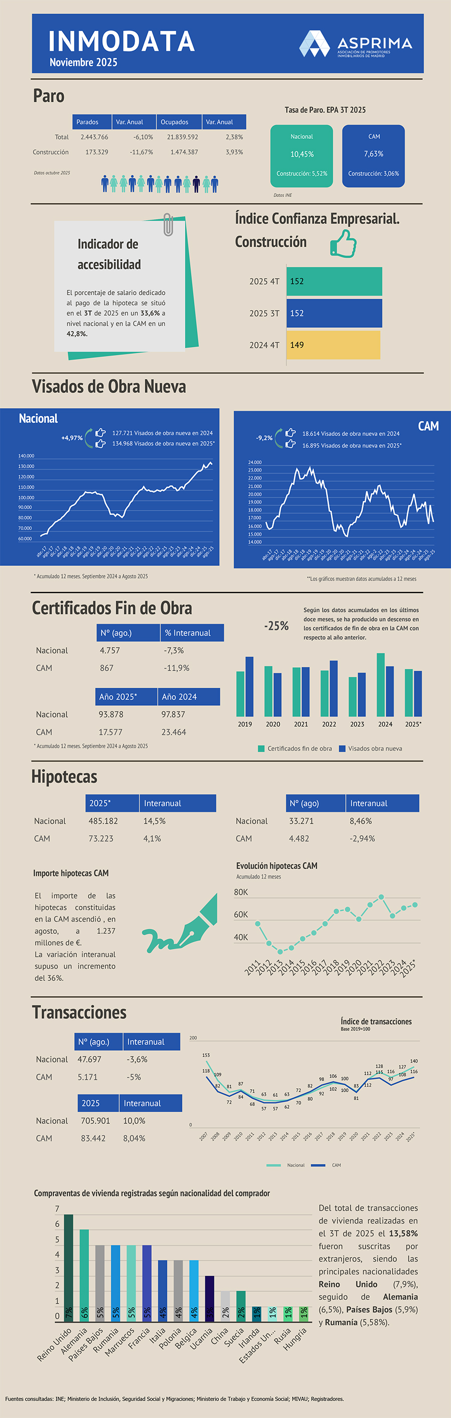 La Asociación de Promotores Inmobiliarios de Madrid (ASPRIMA) acaba de difundir su último informe Inmodata, en el que sintetiza las magnitudes estadísticas básicas del sector de la construcción y la edificación.
